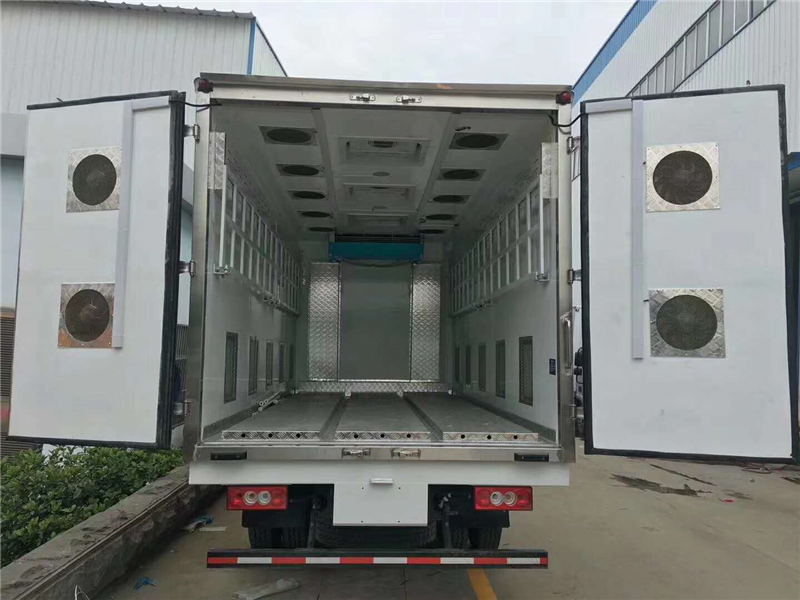 【豬苗車】上裝配置:外玻璃鋼,內(nèi)不銹鋼,兩層液壓升降層板,尾部液壓翻轉(zhuǎn)上豬平臺,層板為不銹鋼骨架鋪鋁花紋板。外部電動升降窗,排氣扇,柴油發(fā)電機(jī),暖風(fēng)加熱,喂水系統(tǒng),凈水箱、污水箱,箱內(nèi)攝像頭監(jiān)控,倒車影像,凱利制冷機(jī)組。(油暖加熱為選裝部件)