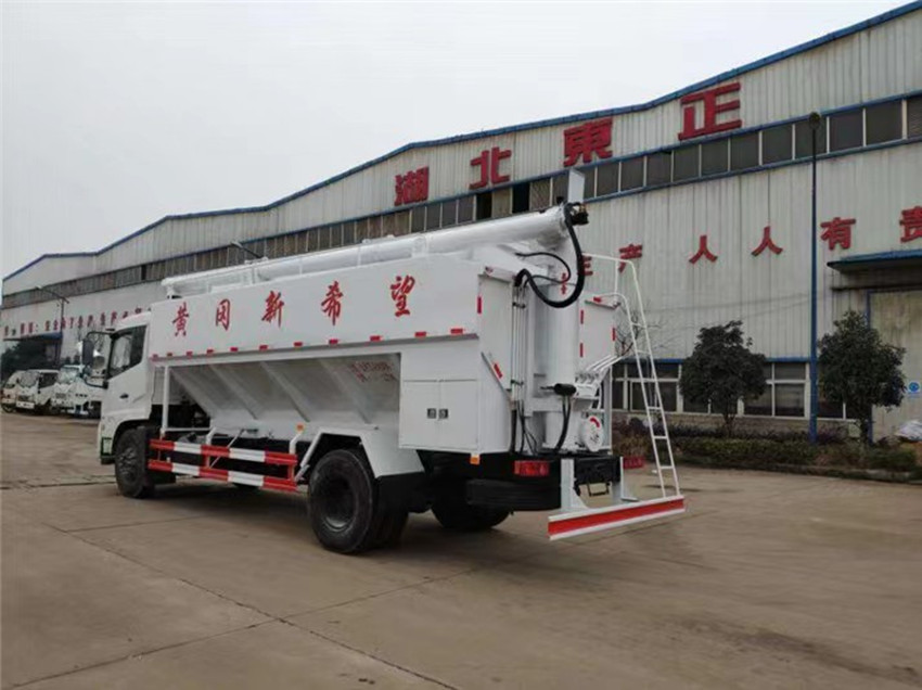 散裝飼料運輸車,散裝飼料車的飼料罐架設(shè)在卡車的底盤上,罐頂開有進料口.頂部的一根螺旋輸送卸料管(俗稱卸料絞龍)則可自由回轉(zhuǎn)和抬升,抬升的仰角可達60度。運輸時,頂部的螺旋管平臥在罐頂;卸料時則抬起,使管端的出料口與畜禽飼養(yǎng)場貯料罐頂部的進料門相接,駕駛室內(nèi)裝有操縱裝置(操縱裝置也可裝置在罐體尾部),卸料時通過車底的動力輸出軸和減速器來驅(qū)動螺旋,以完成卸料。