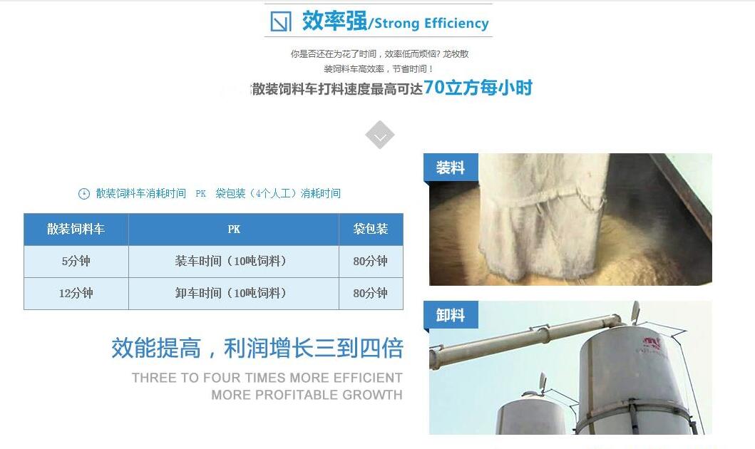1 經(jīng)濟(jì)效益、勞動時間等對比 項目 袋包裝 飼料罐 裝卸費用(1噸飼料) 18元(人工) 2元(電耗) 包裝袋費用(1噸飼料) 20元 0元 裝車時間(10噸飼料) 60分鐘 20分鐘 卸車時間(10噸飼料) 60分鐘 30分鐘 從上表中可以直觀的看出:1.在裝卸費用上,散裝運輸比袋包裝運輸要節(jié)約16元/噸。2.在包裝費用上,散裝運輸比袋包裝運輸要節(jié)約20元/噸。3.在裝卸時間上,散裝運輸比袋包裝運輸要節(jié)約70分鐘。通過以上統(tǒng)計分析發(fā)現(xiàn),散裝飼料運輸車經(jīng)濟(jì)效益非常明顯。
